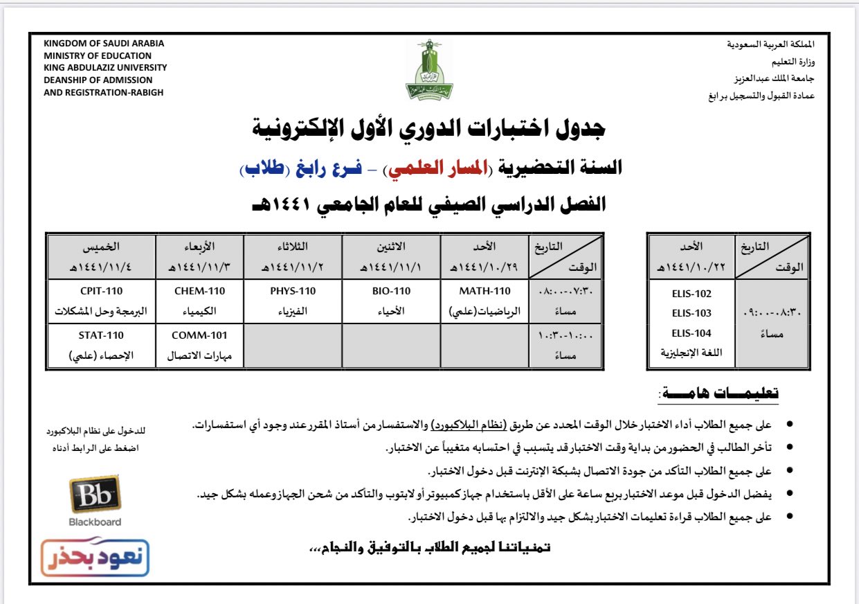 عمادة القبول والتسجيل Kau On Twitter جدول الاختبارات التقييمات النهائية الإلكترونية لطلاب السنة التحضيرية المسار الإداري الإنساني بفرع رابغ بـ جامعة الملك عبدالعزيز Https T Co Ju6zpkptpa